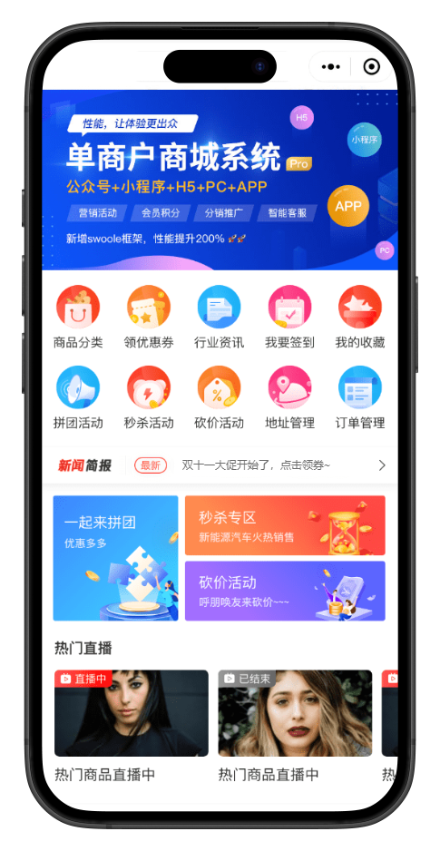 B2C单商户新零售电商系统 以社交电商为核心,搭配分销模式的分销体系,结合拼团、砍价、会员体系等热门社交电商玩法,助力企业突破传统获客瓶颈,实现线上销售业务的长效稳步发展 源码交付 / 独立部署 / 支持二开 / 技术支持 B2C单商户新零售电商系统 以社交电商为核心,搭配分销模式的分销体系,结合拼团、砍价、会员体系等热门社交电商玩法,助力企业突破传统获客瓶颈,实现线上销售业务的长效稳步发展 独立部署 私有化独立部署,数据更安全,数据更值钱 代码全开源 代码全开源,为企业赋能 支持多语言 用户可任意切换中、英、法、意、日、韩、繁等十余种语言 支持二开 开源代码,注释清晰,提供完整的API接口 文档齐全 开发、接口、安装、使用文档齐全,帮助用户快手安装使用 正版授权 官方正版授权,永久使用 满足多行业多场景应用需求 立足电商行业数年,懂客户,更懂营销 直播带货 社区拼团 分销电商 会员电商 视频生鲜 服饰鞋帽 商超百货 数码家电 更多行业 产品介绍 B2C单商户新零售电商系统,完美契合私域流量变现闭环交易使用,系统拥有丰富的营销玩法,强大的分销能力,支持DIY多模板,前后端分离。无论运营还是二开都是高性价比的开源商城系统 01 精美大方的UI界面 强大的UI设计团队,每个页面都精心设计,遵循统一的设计原则。美观的界面是建立用户信任的重要方式。因此我们持续推陈出新,期望带来不一样的视觉感受 02 丰富的营销工具 产品具有拼团、分销、签到、优惠券、组合销售等各种营销工具,助理企业营收再创新高 03 个人中心 个人中心板块,是用户管理个人信息、订单及享受专属服务的核心区域。顶部展示用户账号,集成 “我的收藏”“浏览记录”“优惠券” 等快捷入口,方便用户随时查看。中间部分聚焦 “我的订单”,清晰呈现待付款、待发货 / 核销、待收货、待评价、售后 / 退款等订单状态,便于用户跟踪购物进程。“积分换好礼” 的醒目推广,引导用户关注积分权益,提升参与度 04 分销拓客,实现裂变质增 事业部分销:公司事业部、代理分析,全连分销数据统计人人分销:全民参与、全员推广,快速实现用户裂变增长指定分销:指定人员参与分销,内部裂变,模式更灵活满额分销:老客带新客,激活用户粘性,轻松实现用户增长 05 统计分析,助力精准营销 多元化:多维度、全方位实时数据采集,让数据统计辅助营销决策精细化:精细化埋点,全链路科学评估运营效果,提升运营掌控能力可视化:智能营销数据看板,实时把握来源趋势,驱动即时决策数据化:全景数据洞察、产品分析、客户画像,助力企业数字化经营 功能亮点 追踪零售行业新趋势,跟进社交电商热门玩法;丰富营销功能加持,让运营更轻松 分销拓客 多种分销模式、多种返佣规则,促进分销裂变推广 营销转化 具备拼团、砍价、秒杀、抽奖、优惠券等多种营销工具 会员管理 用户等级管理+SVIP付费会员制度,充分挖掘会员价值 DIY装修 商城首页DIY自定义装修,个性化设计、更加灵活多变 直播带货 紧跟新零售电商风口,小程序直播带货,实现红利变现 客服系统 系统内置多种客服系统对接,沟通更顺畅 消息通知 对接阿里云和腾讯云短信,具备全面周到的消息提醒服务 运费模板 多元化的运费计算方式,可进行满额包邮、续件运费优惠等 用户管理 用分组、标签进行用户分类管理,提取精准用户画像 积分商城 利用积分调动现有用户积极性,提高用户活跃度 米凡妮·让电商更简单